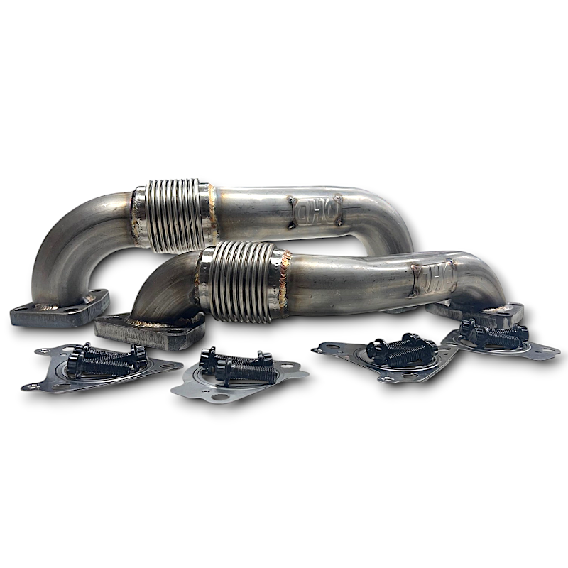 DHD has taken OEM replacement to a new level. This stock replacement up pipe set allows 53% greater flow than stock and is a direct bolt-on to your factory manifolds. Unlike factory parts, our up pipe is manufactured from 11 gauge 304 stainless steel and includes DHD's HD 304 stainless steel, internally-sleeved bellow that can take the abuse of high temperature and high pressures. Each up pipe outweighs the competition by nearly a pound and features internal and external flange TIG welds!