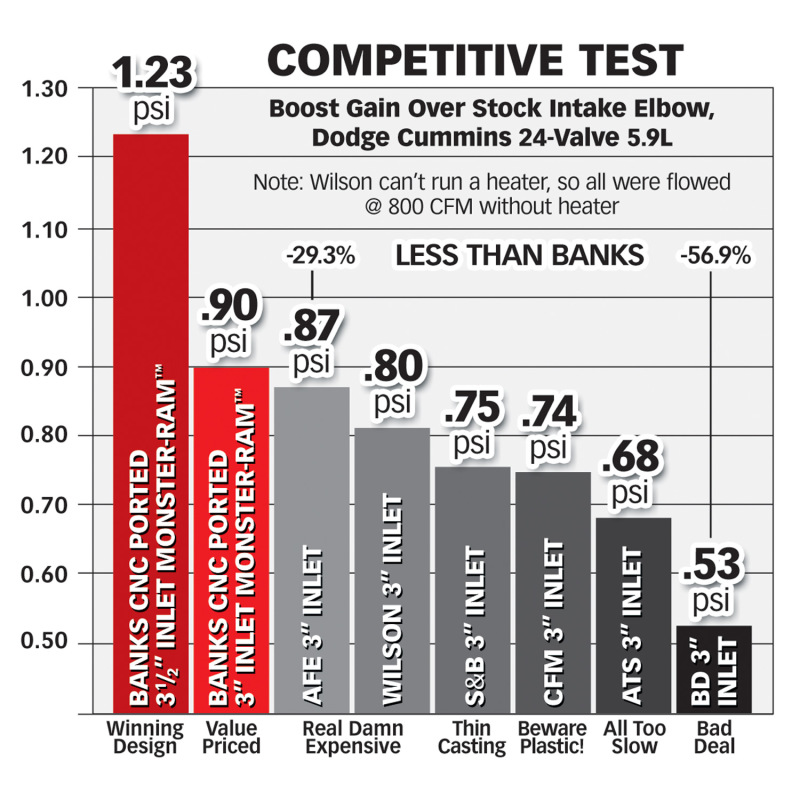 Monster-Ram raises boost without increasing backpressure at the turbine by Improving airflow from the intercooler. Result: a more responsive, fuel-efficient engine. Has six 1/8-inch NPT ports! Includes boost tube. The Banks Monster Ram is the highest performing Cummins Intake Elbow on the market, outflowing all competitors including our previous designs! Key Features: Delivers instant torque Quicker throttle response Improves airflow from the intercooler Larger and less restrictive than stock intake Raises boost without increasing turbine drive pressure Uses OEM Boost Tube Up to six 1/8-inch NPT ports Out-boosts the competition by up to 56.9% CNC port-matched for stock heater and Banks Billet Heater Delete Optional 3.5-inch mandrel-bent boost tube