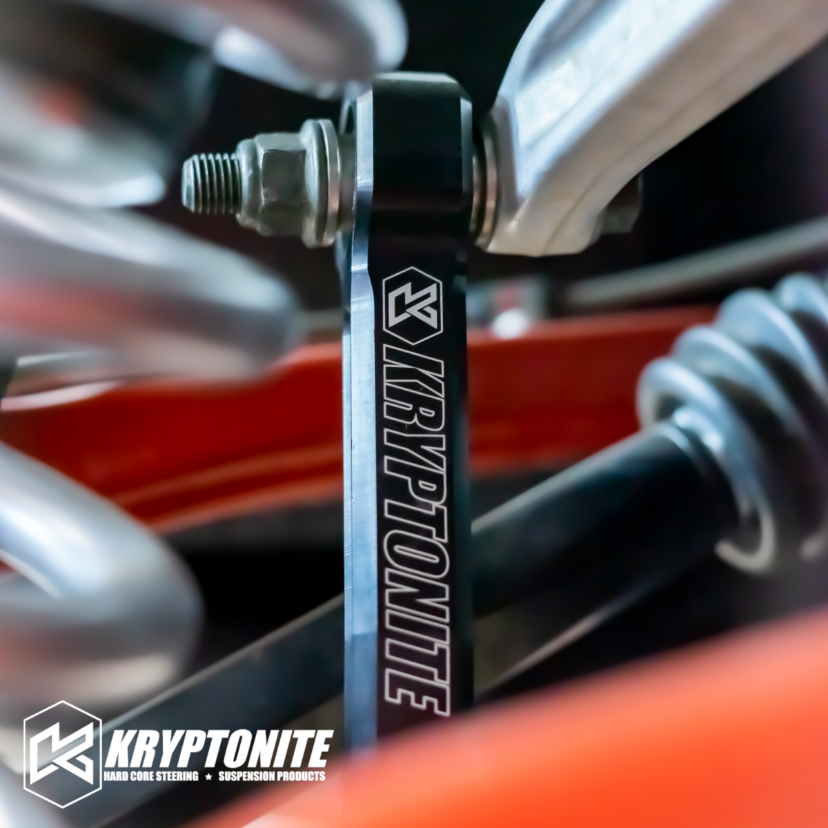 Now available, the Kryptonite Death Grip Front Sway Bar Links are the best way to strengthen and improve your RZR's steering and suspension. These links utilize heavy duty Uni-Ball joints. Eliminating the flex and lag time of OEM link, the oversized link body improves strength and response, helping to keep your machine firmly planted in the corners. This kit includes everything you need for install and is backed with our lifetime warranty. These links a great addition to any RZR that came with a factory front sway bar. Sold as pair. If you demand the absolute best for your RZR this is it!