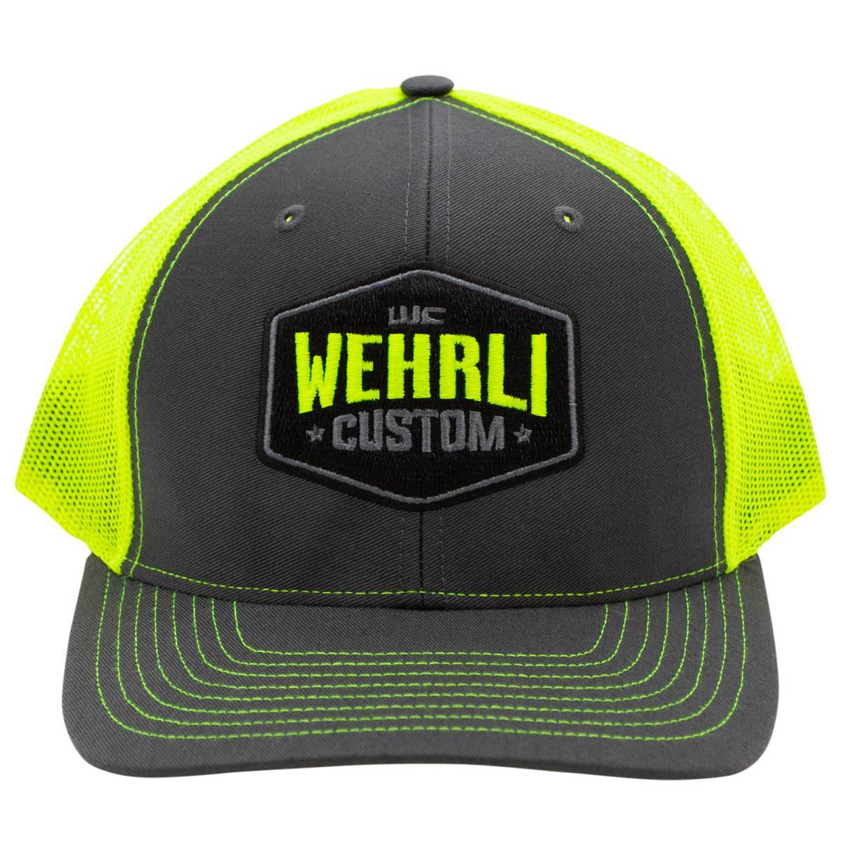 Snap Back Hat with Mesh back. Charcoal/Neon Yellow, embroidered Wehrli Custom Fab Badge Logo.