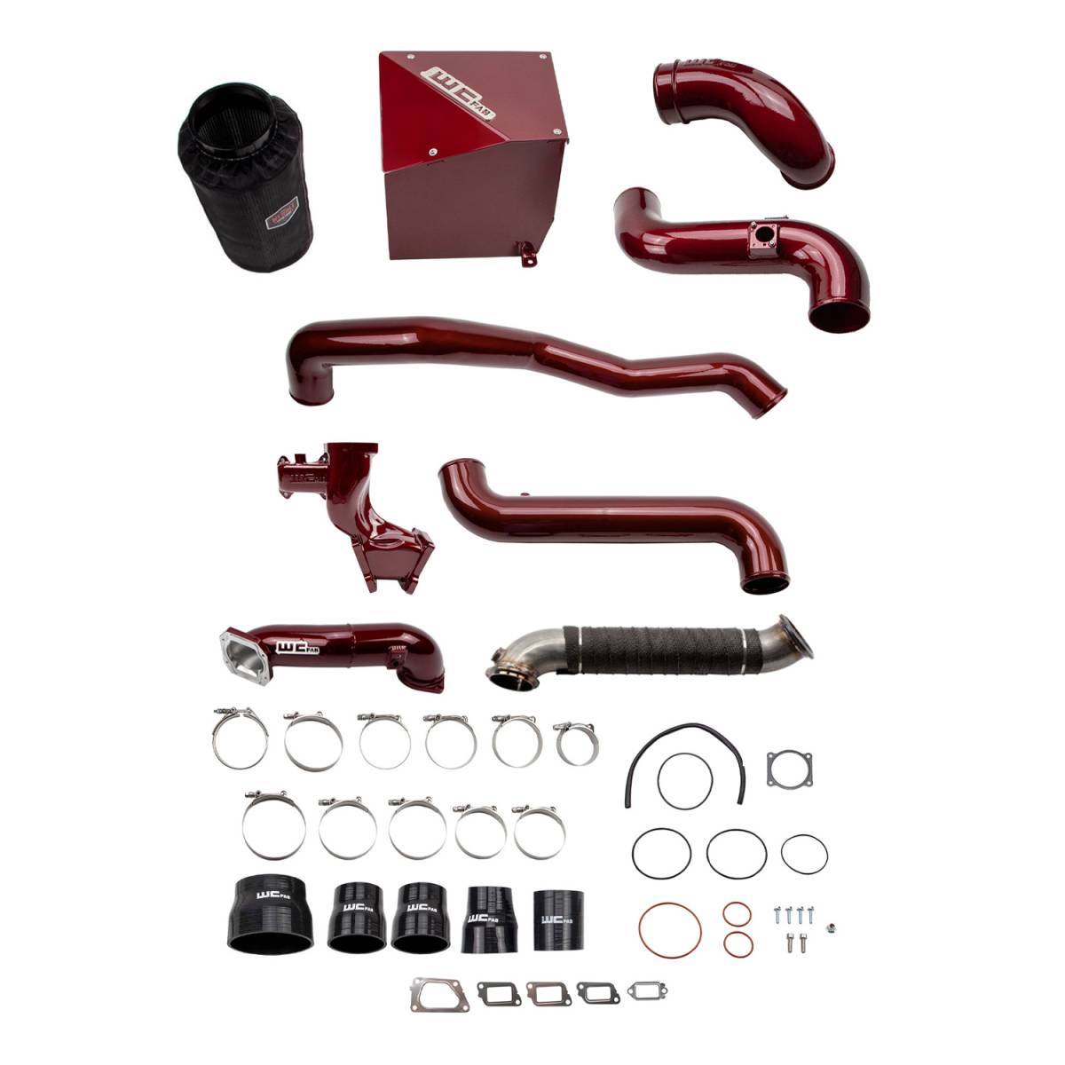 The high-flow, fabricated aluminum intake pipe and air box enclosure with dry filter assembly replaces the restrictive plastic factory parts on your diesel for improved engine performance. The new design significantly increases airflow to your turbo, producing improved horsepower and torque, quicker throttle response, and cooler intake temperatures by drawing cold air through the inner fender. All aluminum construction features large diameter 4" piping with smooth aerodynamic bends to improve intake air velocity volume and provide more aggressive engine and turbo sound during acceleration. High-quality hardware, silicone boots, seals, and stainless steel t-bolt clamps ensure optimum durability and ease of installation. Removable air box lid element allows for easy visual inspection and maintenance of your WCFab filter with included hydrophobic pre-filter cover to help keep your MAF sensor, turbo, and engine airways contaminant free.