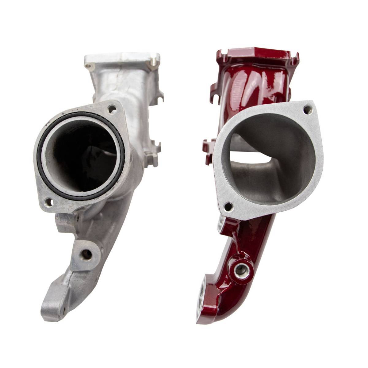 The 3" High Flow Driver (Hot) Side Intercooler Pipe replaces the factory two-piece 2.5” pipe with a high flow 3" pipe. The 3.5" High Flow Passenger (Cold) Side Intercooler Pipe replaces the factory plastic two-piece pipe with a high flow, 14 ga. aluminum one-piece 3.5" pipe. Includes upgraded silicone boots to withstand higher boost pressures than the factory components to increase reliability and eliminate blown factory boots and horsepower-robbing boost leaks.