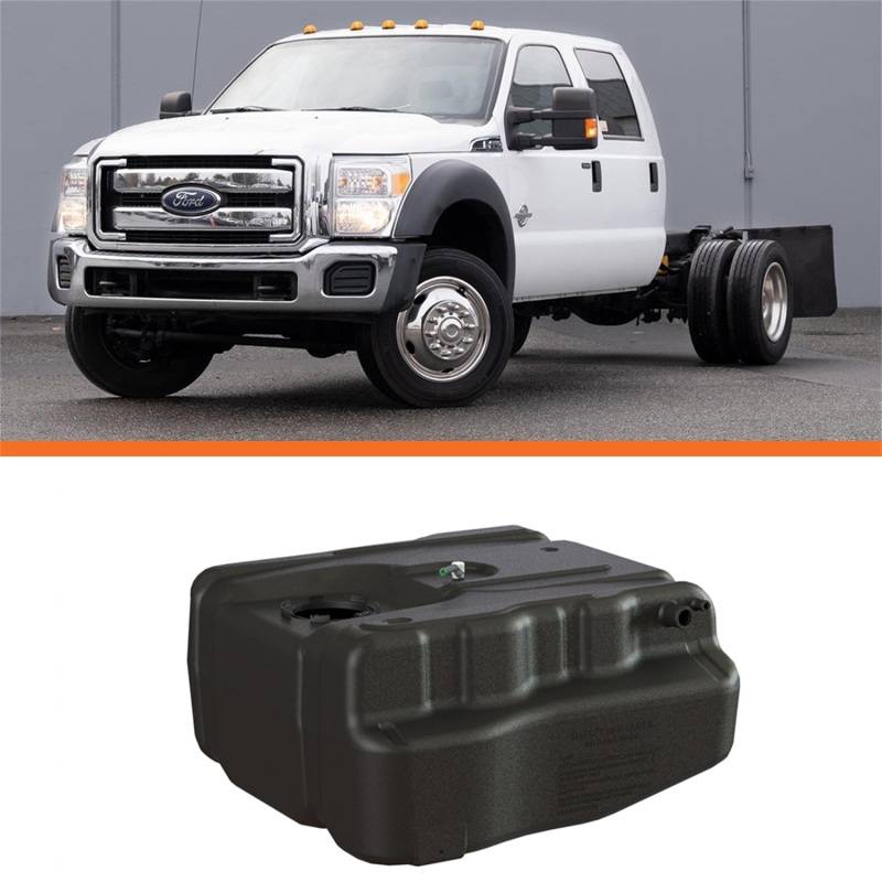 40 Gallon*, extra heavy duty, frame mounted, after-axle replacement tank. Tank is constructed of military grade cross-linked polyethylene (XLHDPE). Compatible with most bio-diesel fuel.Note: Sending Unit is NOT included with tank. For F-350, F-450, and F-550 Narrow Frame, Cab and Chassis vehicles. For model years 2011-2016 •LIFETIME WarrantyTank solves the problem of lining failure and corrosion in steel OEM tanks caused by fuel quality issues which can lead to extremely expensive fuel system repairs. Tank is light in weight, corrosion-proof, extremely durable and features a drain plug for easy maintenance. Complete with rollover vent valve, and stainless steel interior flanges.Fits in the place of the OEM stock tank. For diesel fueled vehicles only.Approximate overall tank dimensions: 29.95 in. x 31.1 in. x 15.00 in.. Shipping box dimensions, approximate: 32 in. x 32 in. x 16 in.. Gross Shipping weight: 44 lbs.In most cases this product replaces the following original FORD equipment part numbers: CC3Z9B210B, CC3Z9002B