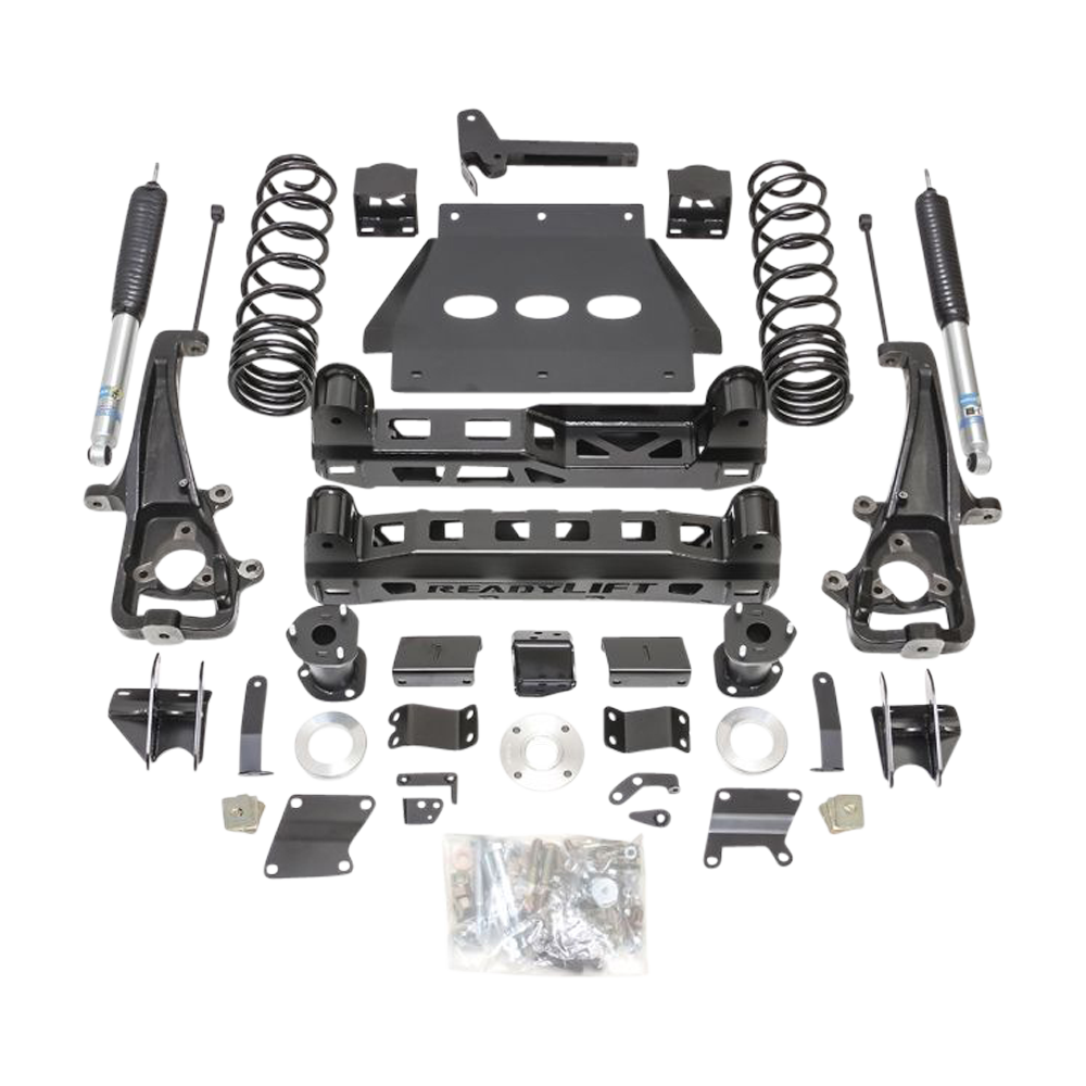 Note: This kit is for the RAM 1500 with factory 22" wheels and no air ride. Kit requires a larger bore knuckle assembly due to larger wheel bearing assembly. If installing this kit any Off-Road Group Package equipped truck, ReadyLIFT recommends foregoing the front preload spacer installation - the lifted vehicle will sit about 1/2" front high with the preload spacer installed or 3/8" low without the preload spacer. This kit is NOT compatible with (1) adjustable "air ride" suspension equipped models, (2) diesel engine applications, or (3) Ram TRX.