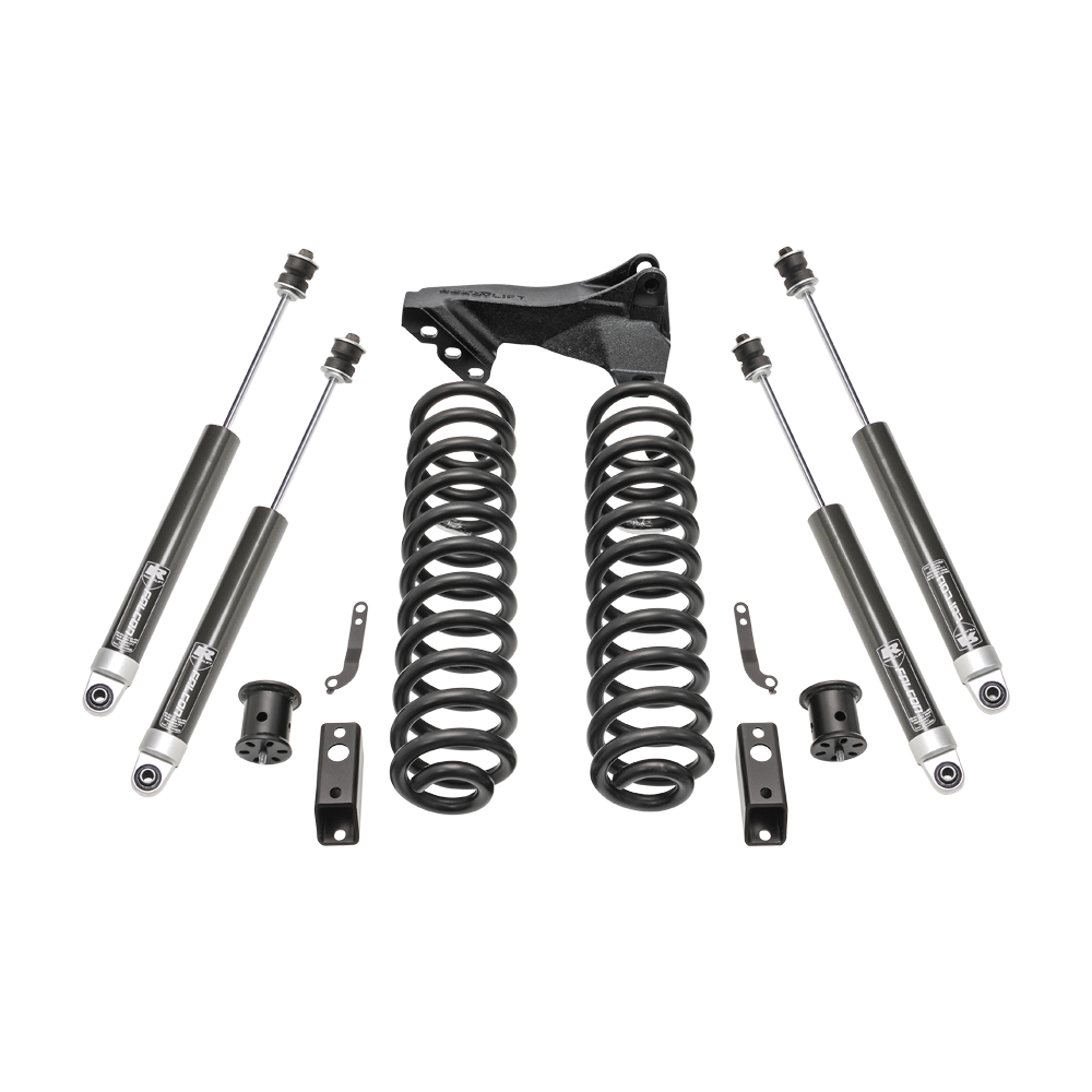 ReadyLIFT Suspension offers a 2.5" Lift Coil Spring Front leveling Kit made to fit 2017-2019 Ford Super Duty F250/F350/F450 4WD trucks. This kit includes front and rear Falcon 1.1 Monotube series shocks and our popular front track bar relocation bracket. This gives Super Duty owners an excellent alternative for lifting the front of your truck. This great new front leveling system will raise the front of your 2017-2019 4WD Super Duty truck 2.5" while including added value components such as the premiere Falcon 1.1 Monotube shocks and our track bar relocation bracket.. The 46-2724 coil spring system allows for increased tire sizes and widths along with providing improved ground clearance and a more commanding view of the road. This premiere leveling kit easily allows for 35" tall tires. The 46-27240 coil spring leveling kit delivers a great ride and handling performance! The key ingredients to improving your ride are the new specially engineered coil springs teamed with Falcon 1.1 Monotube series shocks and a track bar relocation bracket! This combination is more than just a leveling kit. This is a performance and rides enhancing kit that will really surprise you at how well it rides and performs both on and off-road. The ReadyLIFT 2.5" Coil Spring Front leveling kit system for 2017-2019 Ford Super Duty F250 and F350 trucks also included model-specific brake line extension brackets, Our time-tested bump stop extension brackets, and new front sway bar frame mount extension brackets to keep the factory sway bar where is supposed to be. If you want tough looks and a smooth but controlled ride, then you want the new 46-2724 Coil Spring Leveling Kit System. Your truck will thank you! NOTE: Super Duty trucks, depending on factory spring rate, may experience a minor variation in lift height. The final lift height may vary from 1.5" to 2.5". NOTE: Not recommended for TREMOR editions.