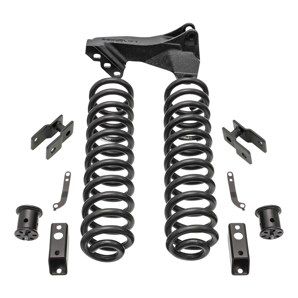 ReadyLIFT Suspension now offers a 2.5" Lift Coil Spring Front leveling Kit including our popular front track bar relocation bracket made to fit 2011-2019 Ford Super Duty F250/F350/F450 4WD diesel trucks. This gives Super Duty owners an excellent alternative for lifting the front of your truck while providing the flexibility of selecting your own aftermarket front shocks.. This great new front leveling system will raise the front of your 2011-2019 4WD Super Duty truck 2.5" while including added value components such as the our track bar relocation bracket.. The 46-2728 coil spring system allows for increased tire sizes and widths along with providing improved ground clearance and a more commanding view of the road. This premiere leveling kit easily allows for 35" tall tires. The 46-2728 coil spring leveling kit delivers a great ride ride and handling performance! The key ingredients to improving your ride are the new specially engineered coil springs teamed with a track bar relocation bracket! This combination is more than just a leveling kit. This is a performance and ride enhancing kit that will really surprise you at how well it rides and performs both on and off road. The ReadyLIFT 2.5" Coil Spring Front leveling kit system for 2011-2019 Ford Super Duty F250/F350/F450 trucks also included model-specific brake line extension brackets, Our time-tested bump stop extension brackets and new front sway bar frame mount extension brackets to keep the factory sway bar where is supposed to be. If you want tough looks and a smooth but controlled ride, then you want the new 46-2728 Coil Spring Leveling Kit System. Your truck will thank you! NOTE: Super Duty trucks, depending on factory spring rate, may experience a minor variation in lift height. Final lift height may vary from 1.5" to 2.5". NOTE: 2011-2016 F250 vehicles may require a rear block kit to achieve a level stance. NOTE: Not recommended for TREMOR editions.