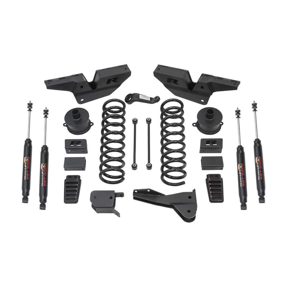 ReadyLIFT 6'' Lift Kit fits 2014-2018 Dodge Ram 2500 4WD Series diesel short bed trucks. ReadyLIFT Suspension This exciting lift system is Made in the U.S.A. and provides 6'' of front lift and features the best engineering technology you will find on the market today. The 49-1600 series 6" system utilizes performance front coil springs providing a true 6'' of front lift. In the rear, we use our proven spacer design technology to design heavy-duty 3.5" lift rear spacers which team up perfectly with the factory rear coil springs. This system includes a lift structure that will enhance and improve the overall factory ride while greatly improving off-road performance. Along with performance springs and spacers, our engineering team also developed rugged frame-mount radius arm drop brackets that reposition the factory radius arms back to the factory position. This is important so that the OEM alignment geometry can be retained. We also include heavy-duty fabricated steel front and rear track bar brackets, dropped cast iron front pitman arm, and front sway bar relocation brackets. We even include front/rear bump stop extensions to prevent over-compression during off-road use. Kit includes four (4) SST3000 Shocks. This new 6-Inch performance suspension system is designed specifically for the 2014-2018 Dodge Ram 2500 4WD trucks with diesel engines and will allow for increased tire packages up to 37x13.50 and 9.5" wide wheel sizes from 17-20" diameters.