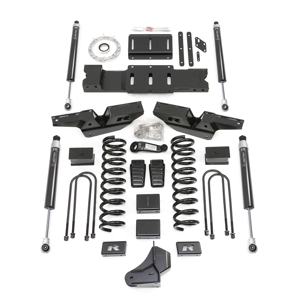 The all-new 4.5" Coil Spring Lift Kits allow for even more ground clearance while going to a 37" tire. Springing up to the new 4.5" lift yields all the bells and whistles of a big 6" kit but at a slightly lower, garage-able stance. These kits come with heavy-duty steel radius arm drop brackets, heavy-duty fabricated steel front track bar brackets, forged dropped pitman arm, sway bar relocation brackets, and bump stop extensions preventing over-compression of the included Falcon 1.1 Monotube front & rear shocks. The 4.5" Ram HD kit includes our unique CNC-machined 6061-T6 billet Aluminum Driveline Indexing System (DIS) that re-clocks the transfer case to properly align the front output shaft for improved driveline angles. The Ram 3500 HD comes with a high-output diesel engine DIS system. Kit 49-19430 includes the new DIS re-positioning components, heavy-duty and great riding 4.5" lift front springs, 3" lift rear taper blocks, heavy-duty radius arm drop brackets, heavy-duty fabricated steel front, track bar brackets, dropped cast iron pitman arm, front/rear sway bar relocation brackets, and bump stop extensions preventing over-compression of the new Falcon 1.1 Monotube front/rear shocks. *Kit will not fit any models with the standard output 6.7L diesel motor, HEMI Gasoline engine, dually models, Classic models, and any automatic-leveling rear air suspension models.