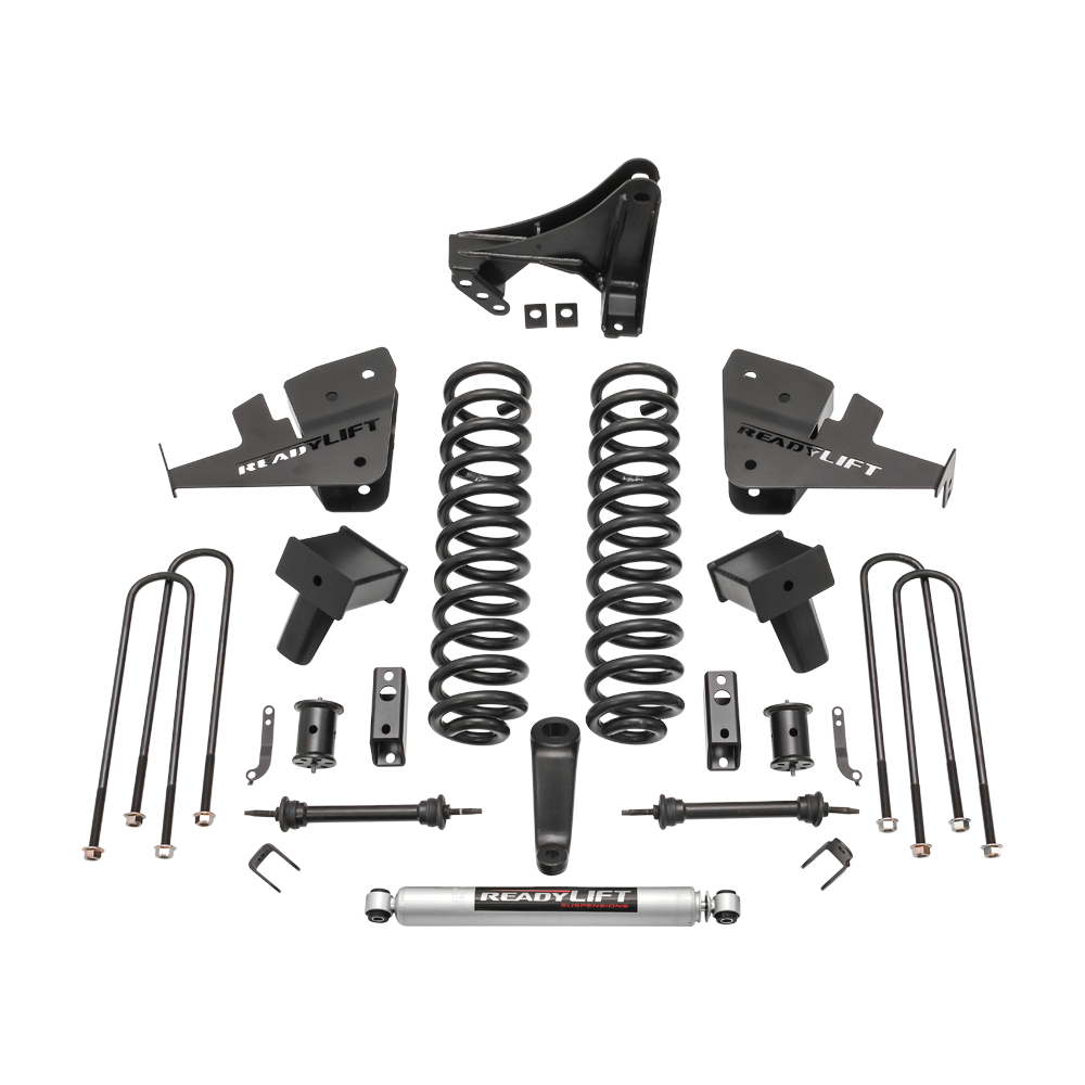 ReadyLIFT now offers a 6.5" Lift Kit system made yo fit 2017-2022 F250 Ford Super Duty 4WD trucks with a one-piece drive shaft. This 6.5" lift kit gives owners an excellent lift kit option that will raise F250 trucks a total of 6.5" in front. This provides for maximum tire clearance and unbeatable off-road performance. Install up to 38" tall off road tires with no problems. This new off road kit delivers uncompromised ride and handling performance! The 49-2765 6.5" Lift Kit includes custom wound coil springs engineered to provide an incredibly great ride while also enhancing off-road driving performance. The kit includes radius arm drop brackets allowing the use of factory radius arms and correcting caster in the process. To lift the rear we include fabricated rear lift blocks with off-set pin design to relocate the axle bringing the rear up level with the front while providing a factory-like ride. Other great components to this kit include a drop pitman arm, track bar bracket, sway bar end links, drive shaft spacer, and all hardware. NOTE: Longer shocks are required when using the this kit. ReadyLIFT SST3000 shock are available and sold separately. NOTE: For use with 1-piece drive shafts only. NOTE: Diesel engines only. NOTE: The lift blocks in this kit are not designed to work with aftermarket or factory add-on air spring/load leveling kits that attach to the bump stop tangs. Use of this type of air bag system will void all block warranties and can cause failure of the block bump stop tang.