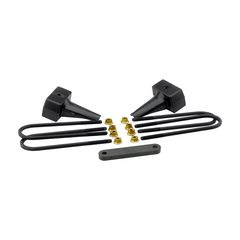 ReadyLIFT OEM-style rear block kits are available for 2011-2016 Ford Super Duty model specific applications. These new 5.0" Rear Block Kits include two (2) Rear Blocks, four (4) 16.5" Long E-Coated U-Bolts, eight (8) Nuts and Washers and one (1) Carrier Bearing Spacer. Based on OEM designs and never made out of light weight extrusions our 5" 2011-2016 Ford F250/F350 Super Duty Blocks have Integrated OEM Style Bump Stops. ReadyLIFT Block Kits will put a slight rake back in your truck for hauling or towing and are designed to work with your ReadyLIFT Suspension Leveling Kit. In fact, these blocks are the ideal Tow Package upgrade for not only for stock height vehicles but lifted or leveled trucks too! Like all ReadyLIFT products, these block kits come with our Limited Lifetime Warranty. Note: 66-2015 5" block is for use on 2011-2016 Ford F250 / F350 Super Duty 2WD/4WD trucks with 2-piece drive shaft. Lift height will vary depending on what factory block your truck has. Note: Fits Single Rear Wheel Trucks ONLY -- Not Dual Rear Wheel Configurations NOTE: The lift blocks in this kit are not designed to work with aftermarket or factory add-on air spring/load leveling kits that attach to the bump stop tangs. Use of this type of air bag system will void all block warranties and can cause failure of the block bump stop tang.