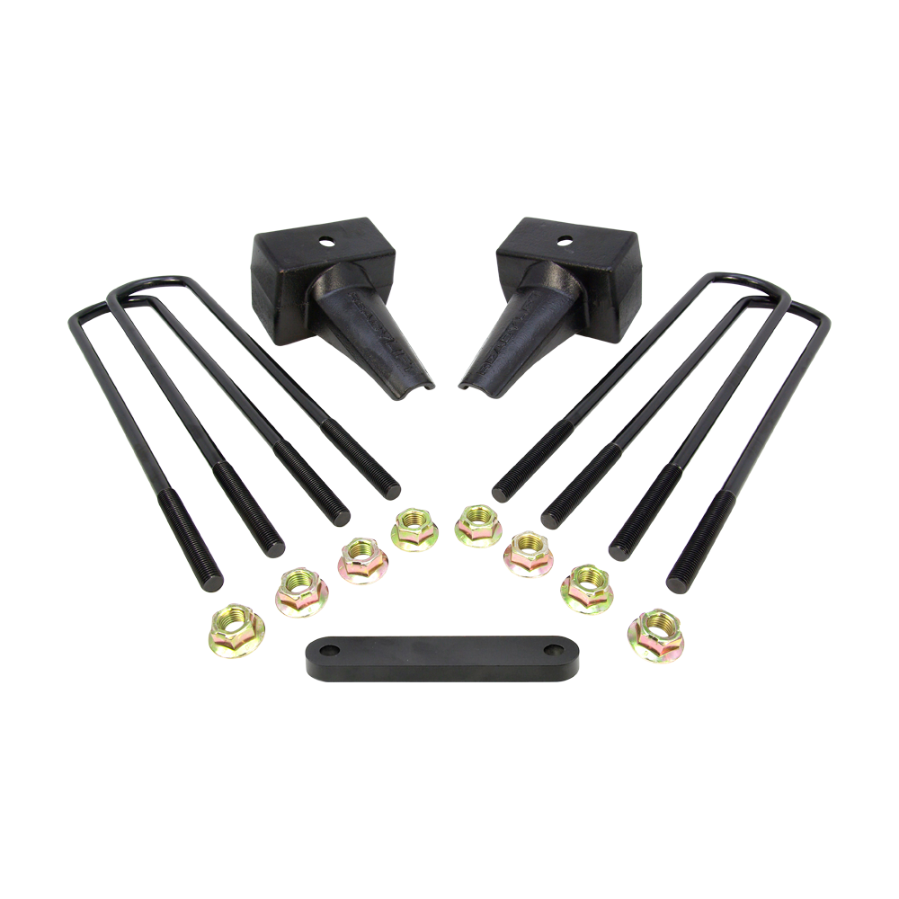 ReadyLIFT OEM-style rear block kits are available for model specific applications. These Rear Block Kits include two (2) 4" Rear Blocks, four (4) E-Coated U-Bolts, eight (8) Nuts and Washers and will safely lift the rear of your 1999-2010 Ford Super Duty 2WD/4WD Truck with a two-piece driveshaft. Based on OEM designs and never made out of light weight extrusions our 66-2294 4.0" Ford Super Duty Blocks have Integrated OEM Style Bump Stops. ReadyLIFT Block Kits will put a slight rake back in your truck for hauling or towing and are designed to work in concert with your ReadyLIFT Suspension Leveling Kit. In fact, these blocks are the ideal Tow Package upgrade for not only for stock height vehicles but lifted or leveled trucks too! Like all ReadyLIFT products, these block kits come with our Limited Lifetime Warranty. NOTE: The lift blocks in this kit are not designed to work with aftermarket or factory add-on air spring/load leveling kits that attach to the bump stop tangs. Use of this type of air bag system will void all block warranties and can cause failure of the block bump stop tang.