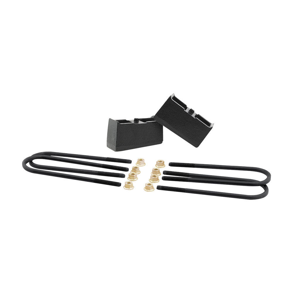 ReadyLIFT OEM-style rear block kits are available for model specific applications. These Rear Block Kits include two (2) 3" Rear Blocks, four (4) E-Coated U-Bolts, eight (8) Nuts and Washers and will safely lift the rear of your truck an additional 1" to 3" depending on the application. Based on OEM designs and never made out of light weight extrusions, our 3" GM Blocks are made from cast iron and have anti-rotation ears built-in. Fits 1999-2021 classic and current body style 6-lug model GM trucks. Models with 1.25" OEM blocks will want to take advantage of the additional 1.75" of lift for towing and hauling, particularly when using a front leveling kit. 1999-2006 4WD trucks will replace the factory 2" block for 1" of additional lift. This kit eliminates the dangers of having to stack blocks which may be illegal in some states. ReadyLIFT Block Kits will put a slight rake back in your truck for hauling or towing and are designed to work in concert with your ReadyLIFT Suspension Leveling Kit. Like all ReadyLIFT products, these block kits come with our Lifetime Warranty. Installation time is approximately 1.8 hours. Note: 2019-UP models may need to trim off excess bolt length after installation. NOTE: This GM 1500 kit is NOT COMPATIBLE with vehicles equipped with rear composite mono-leaf springs. The mono-leaf is easily identifiable the U-bolt is round/circular around the top of the leaf spring. This kit only works with vehicle equipped with traditional steel leaf springs identified by square U-bolts.