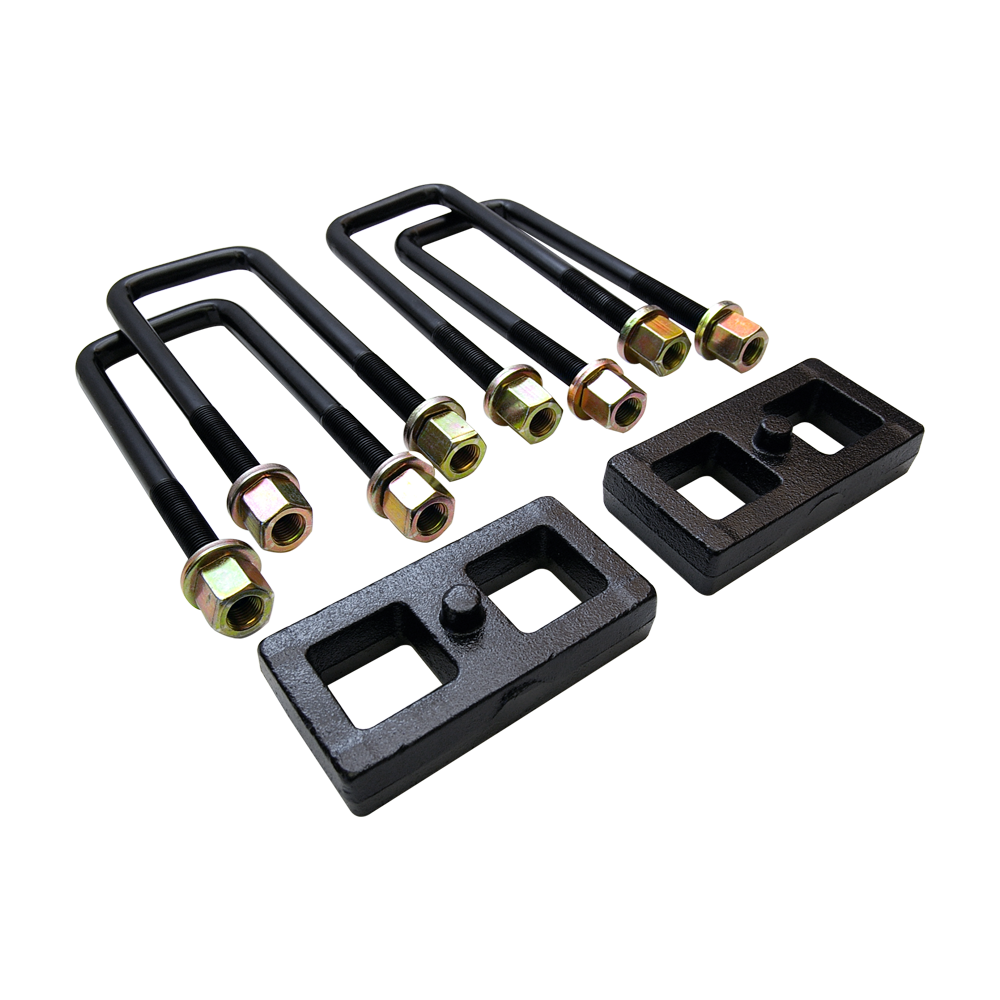 ReadyLIFT OEM-style rear block kits are available for 1995-2023 Tacoma six-lug model and 1999-2021 Tundra applications. These Rear Block Kits include two (2) 1" Rear Blocks, four (4) E-Coated U-Bolts, eight (8) Nuts and Washers and will safely lift the rear of your truck an additional 1". Based on OEM designs and made from cast iron (never made out of light weight extrusions), ReadyLIFT Block Kits will put a slight rake back in your truck for hauling or towing and are designed to work in concert with your ReadyLIFT Suspension Leveling Kit. This is a great Tow Package upgrade. Like all ReadyLIFT products, these block kits come with our Lifetime Warranty.