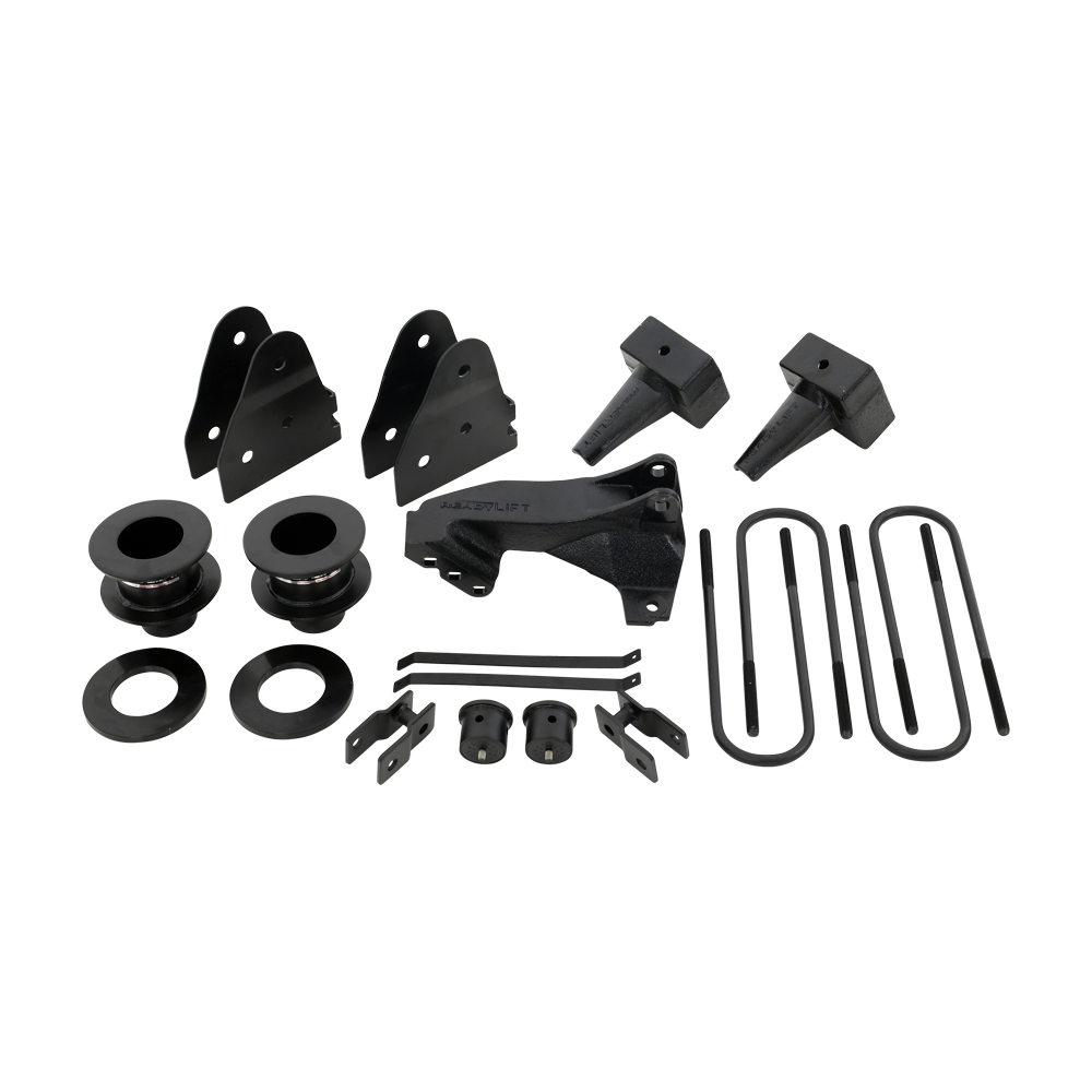 ReadyLIFT Suspension has engineered a 3.5"lift kit made to fit the 2011-16 Ford F250/F350/F450 SuperDuty 4WD trucks with a two-piece drive shaft that allows wheel and tire combinations up to 37" while keeping the smooth OEM ride and drivability. This is a complete lift kit including 5" OEM equivalent rear blocks with integrated bump stop landings, 3.5" coil spring extensions with sound isolators, an OEM-style panhard drop bracket, front bump stops, carrier bearing spacer, OEM shock extension brackets, a pair of radius arm drop brackets, and all needed hardware. When used with the maximum size tires, the F250 truck body is raised over 6". ReadyLIFT's 3.5" SST Fixed Lift Kit System for the 2011-16 Ford F250/F350 4WD Super Duty trucks is a safe, easy way to lift your Super Duty while maintaining your factory ride. Why spend thousands of dollars for an elaborate mega-lift kit that takes extensive time to install while destroying your ride when you can save money and get a great lift height that rides great and looks awesome! ReadyLIFT Smart Suspension Technology is used to make this kit very user friendly to install, requiring no cutting or drilling. Like all other ReadyLIFT kits, the F250/F350 3.5" SST Lift Kit is guaranteed for life against manufacturing defects. NOTE: For use with trucks with a one-piece drive shaft. NOTE: The lift blocks in this kit are not designed to work with aftermarket or factory add-on air spring/load leveling kits that attach to the bump stop tangs. Use of this type of air bag system will void all block warranties and can cause failure of the block bump stop tang. Diesel engines only. Gas engine trucks will sit nose high.