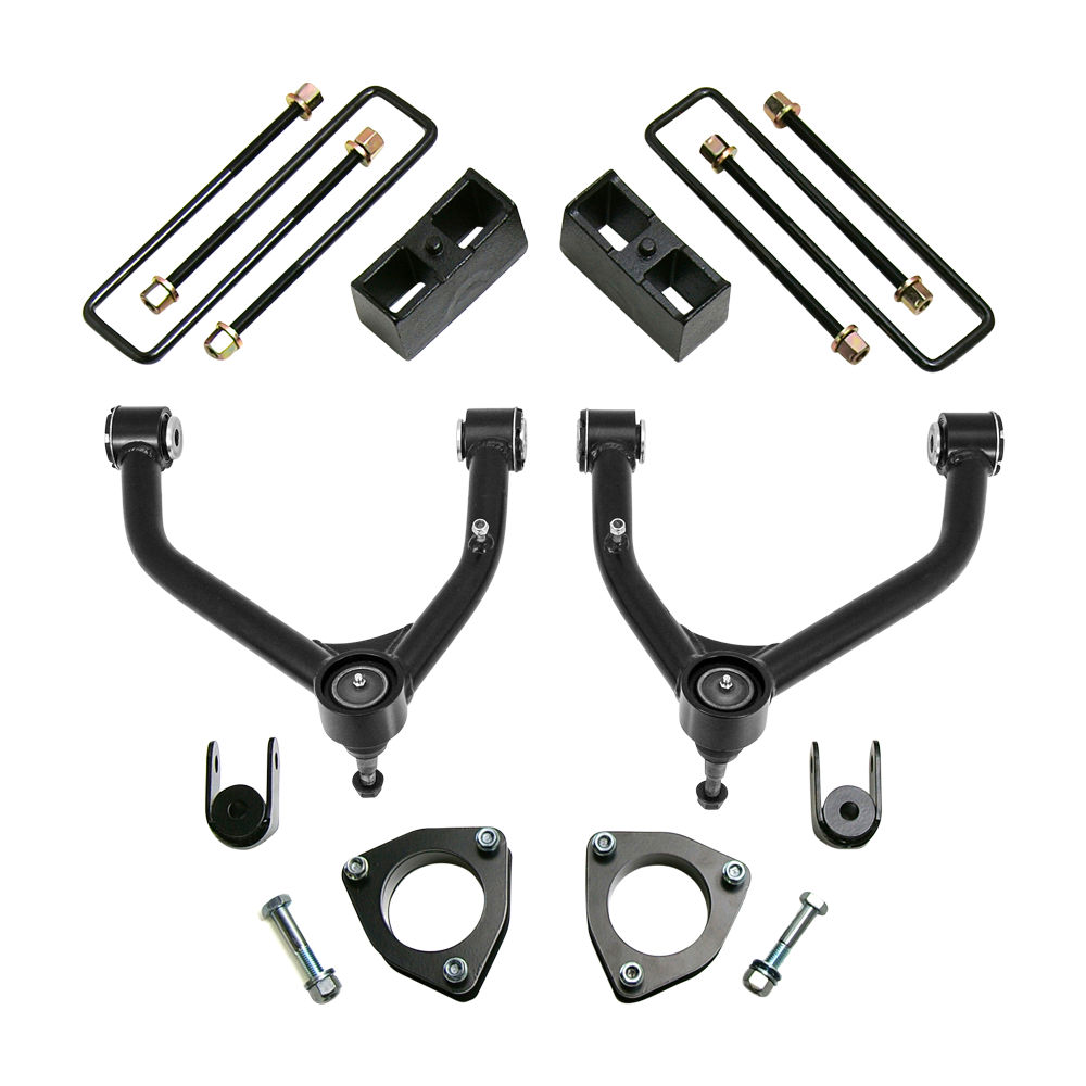 Introducing the ReadyLIFT SST Lift Kit system for 2007-2016 1500-series Silverado/Sierra 6-lug 2WD Trucks, now with ultra-strong TCT free-floating pivot bushings for friction-free operation. This innovative 4.0" lift kit is entirely bolt-on, a result of over six months of rigorous product development and testing. It offers increased ground clearance, accommodating tire sizes up to 33" on aftermarket wheels, such as 33x11.50 on 22x9.5 wheels with 5.5" backspacing or 17x9 wheels with +0 offset on a 285/70R17. The system raises the front of your Silverado/Sierra 1500 2WD trucks by 4.0" using robust powder-coated steel strut extensions, which don't require any irreversible modifications to the factory strut. Additionally, it includes 100% DOM tubular upper control arms with OEM-style ball joints, providing clearance and maintaining OEM geometry without spindle modifications. To lift the rear, the kit incorporates 3.0" OEM-style cast iron rear lift blocks and U-bolts, featuring pinion angle correction and axle locating ears for a perfect fit and performance. The rear shock extensions maintain the factory mounting position for a great ride with your existing shocks. This system is backed by a Limited Lifetime Warranty from ReadyLIFT. Please note that the kit is designed for use with aftermarket wheels with a backspacing of 5.25". If you plan to use stock wheels with larger aftermarket tires, you'll need a wheel spacer to prevent tire contact with the control arm at full locked turn. ReadyLIFT offers a CNC-machined billet aluminum wheel spacer (10-3485) for factory wheels with stud pockets. Ensure compatibility with your vehicle, as some 2016 models with stamped steel Control Arms or Aluminum upper Control Arms are not suitable for this lift kit. Finally, this kit is not intended for off-roading purposes.