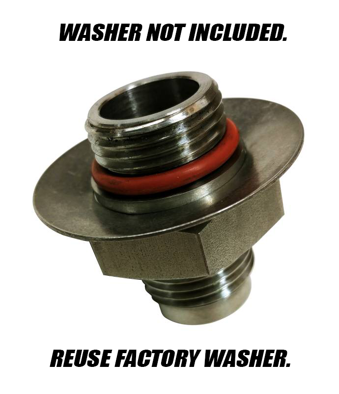 NOTE: Due to the thread height of this fitting you will need to reuse the factory tank washer. This will ensure the fitting tightens up correctly and the internal cooler is sealed against the coolant tank. See Below: