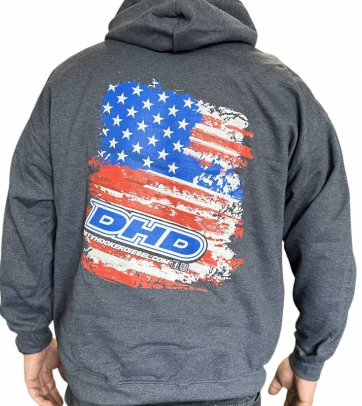 4 color screen printed extra large graphic printed front and back on a 50/50 Heather Gray Hoodie